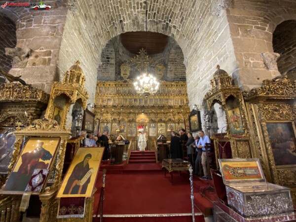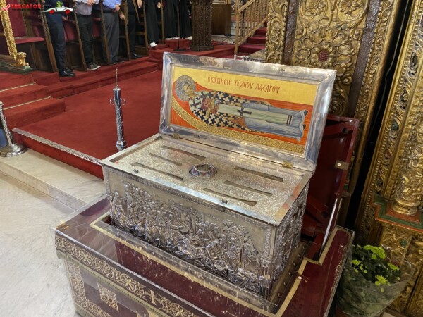 Interiorul impresionează prin iconostasul din lemn aurit (sec. XVIII), sculptat de Chatzisavvas Taliadorou și acoperit cu foiță de aur, precum și prin fresca și icoanele rar întâlnite. Sub altar se află o criptă ce adăpostește un sarcofag de marmură cu rămășițe atribuite Sfântului Lazăr, descoperite în 1972.
