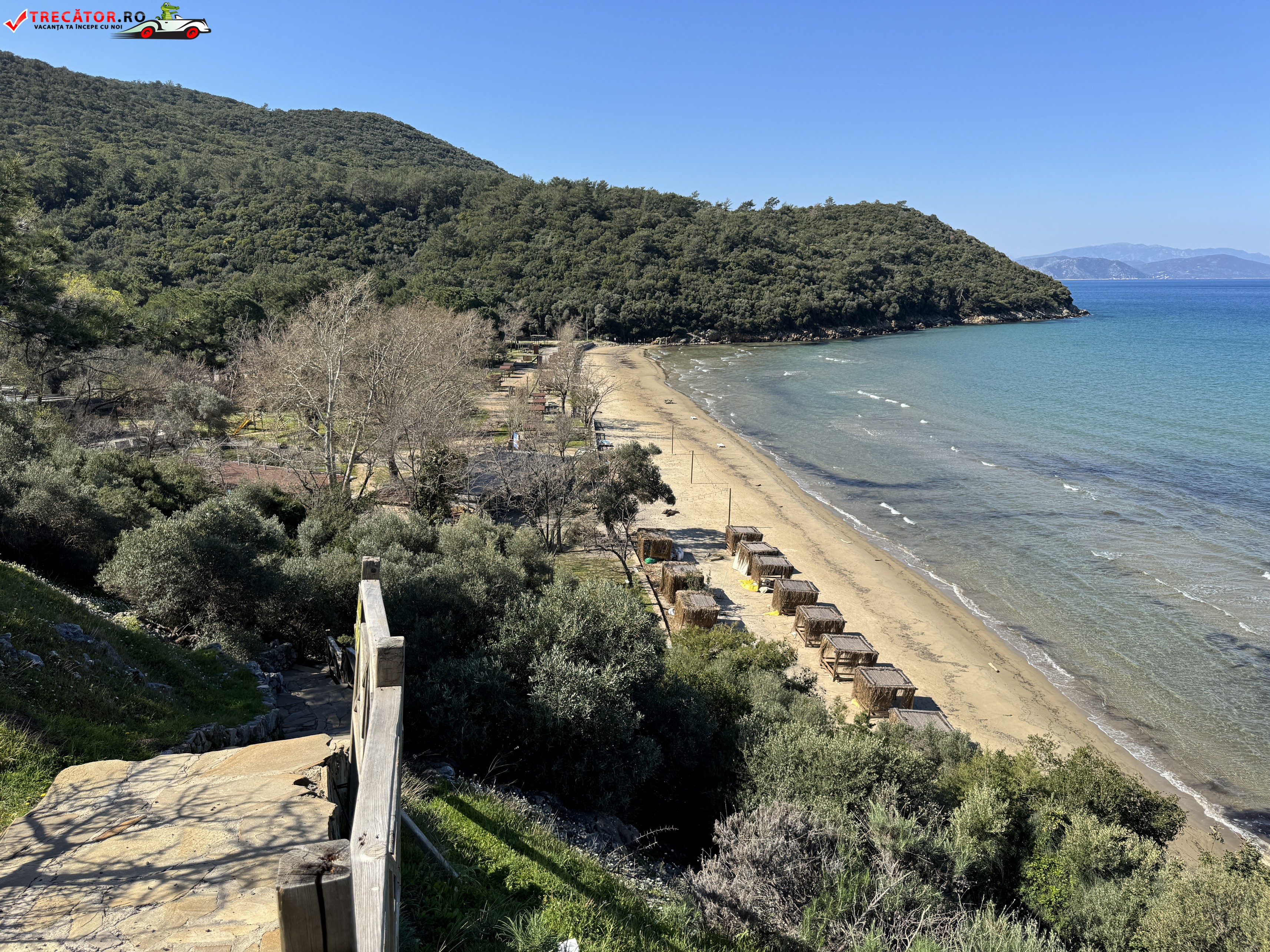 Situat în zona Güzelçamlı, în Parcul Național Peninsula Dilek–Delta Büyük Menderes, İçmeler Koyu este prima plajă pe care o întâlnești după intrare și una dintre cele mai ușor accesibile opriri de pe acest țărm protejat. Golful este apreciat pentru plaja sa cu nisip și pentru apa puțin adâncă de la mal, detalii care îl fac potrivit pentru familii, pentru înot relaxat și pentru o zi de plajă fără grabă. În jur, pădurea de pini coboară spre mare, iar peisajul are acel contrast foarte fotogenic dintre verdele dens și albastrul limpede al Egeei.