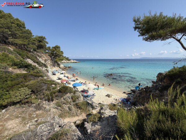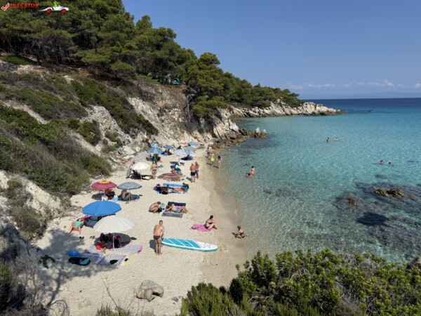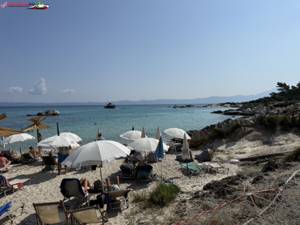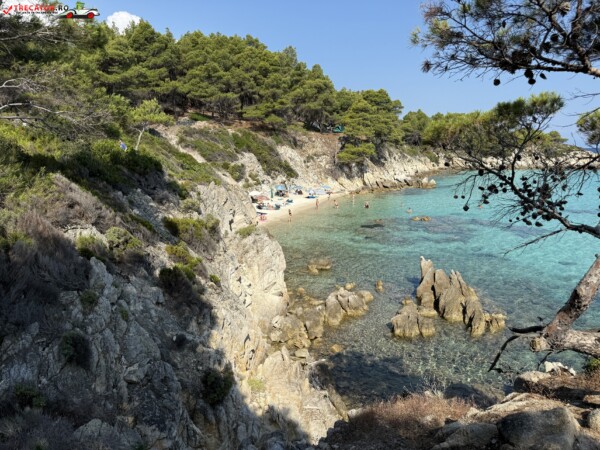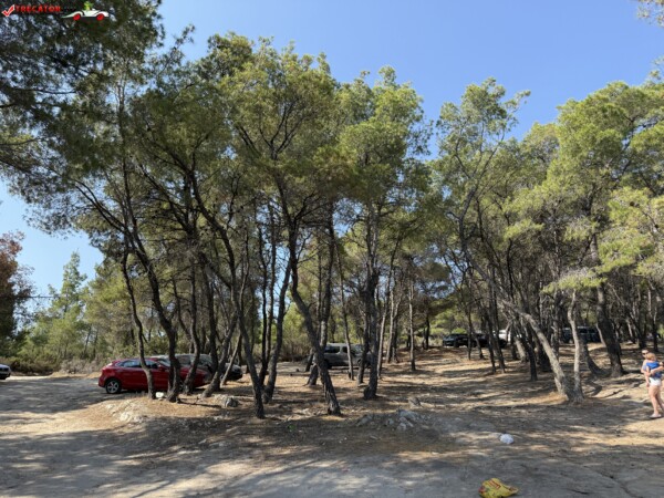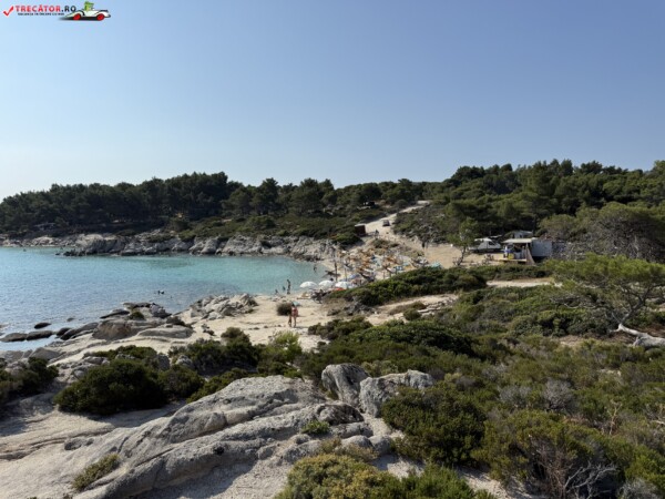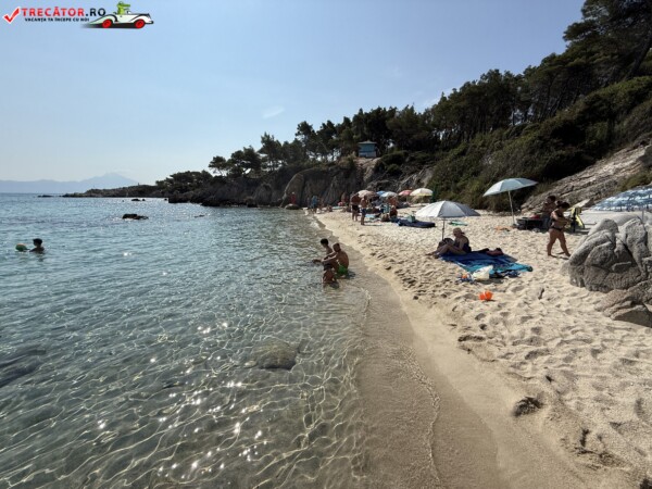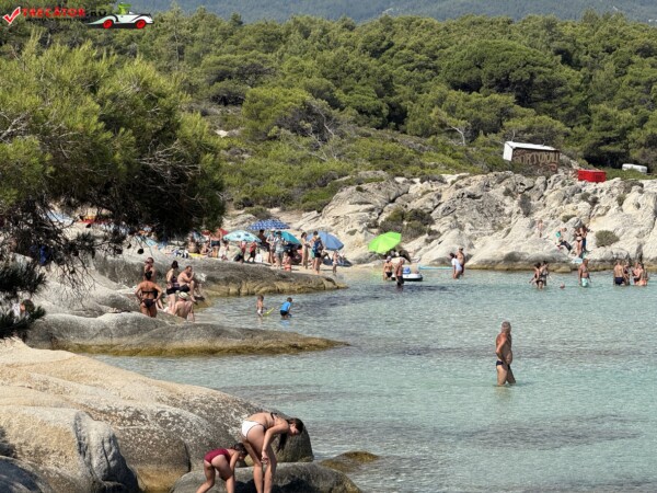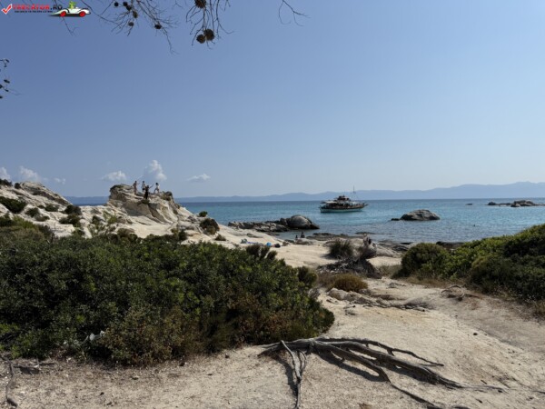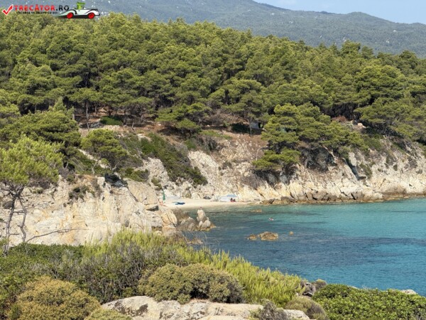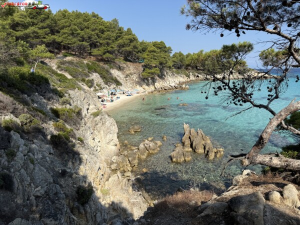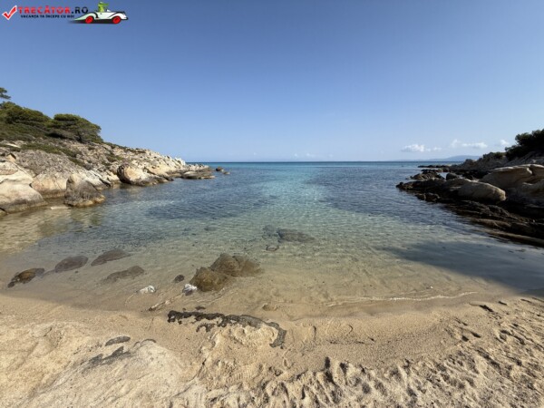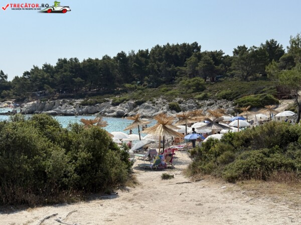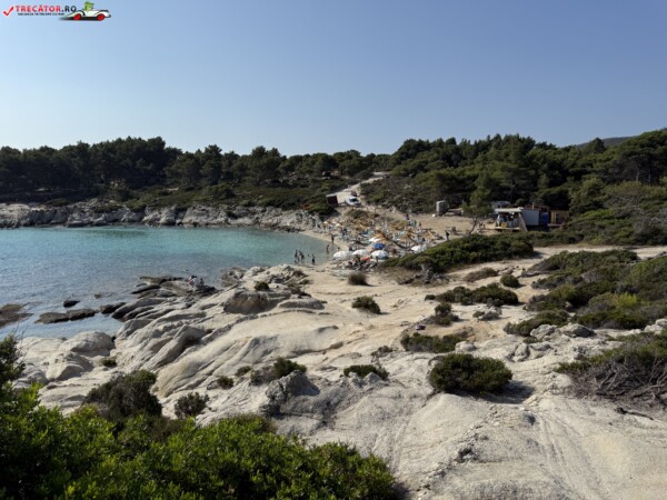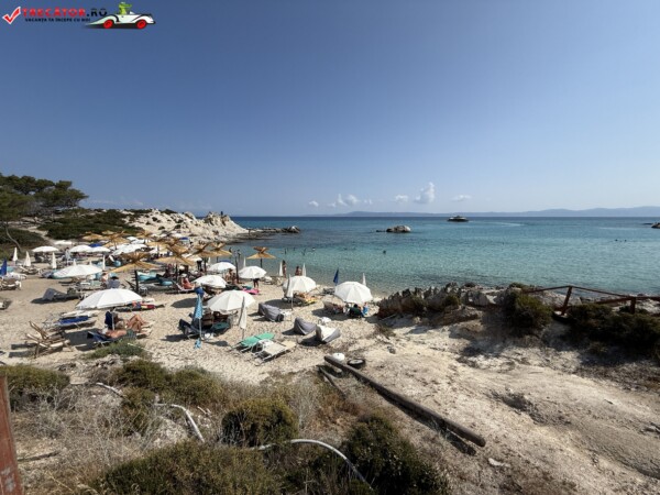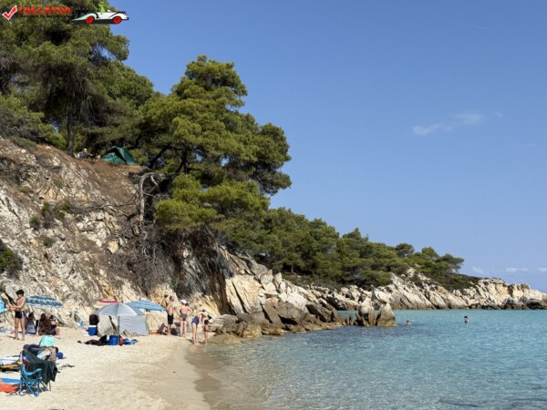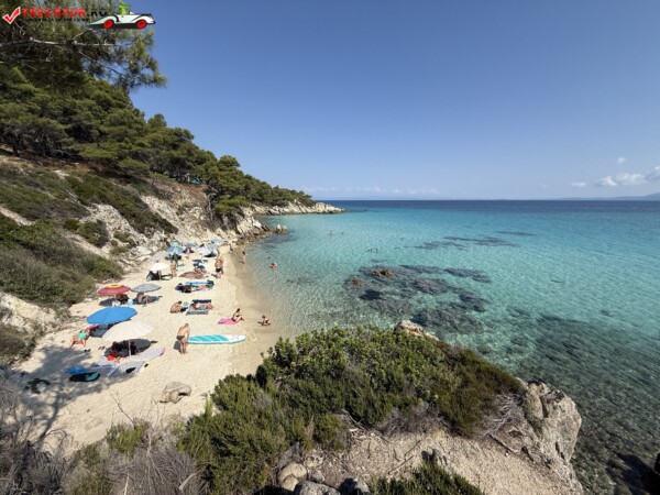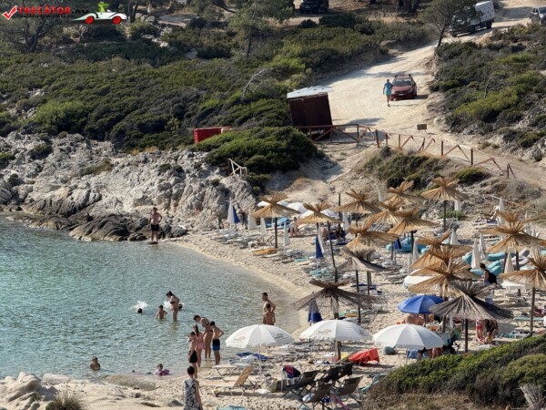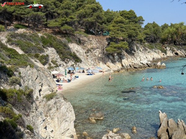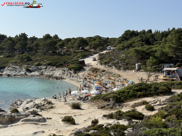 Principala „Cala Portokali” este amenajată cu șezlonguri și bar, dar covoarele mai mici din jur oferă intimitate totală, umbră din pini și liniște . Accesul se face cu mașina, pe un drum forestier neasfaltat și apoi pe jos câțiva zeci de metri, existând locuri de parcare lângă traseu . Nu există toalete, dușuri sau salvamari, așa că e indicat să vii cu apă, gustări și umbrele personale, mai ales în vârf de sezon . Pentru fotografi, snorkelari și aventurieri, acest loc este un paradis – se pot explora peșteri subacvatice, formațiuni stâncoase și covoare de nisip izolate.