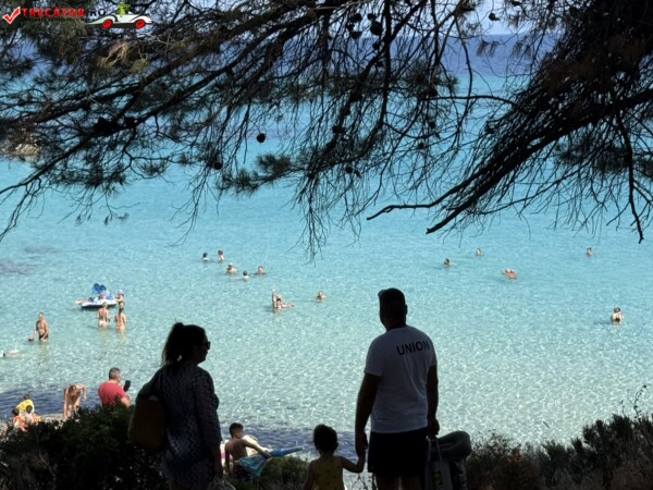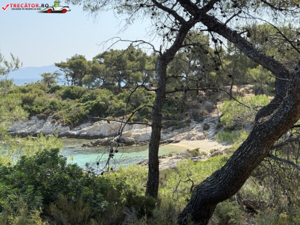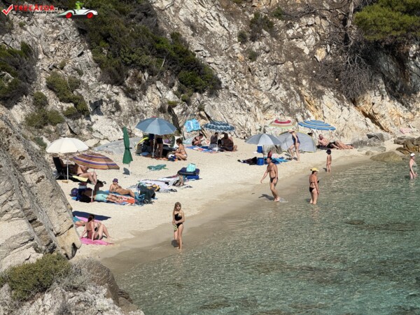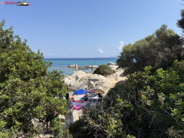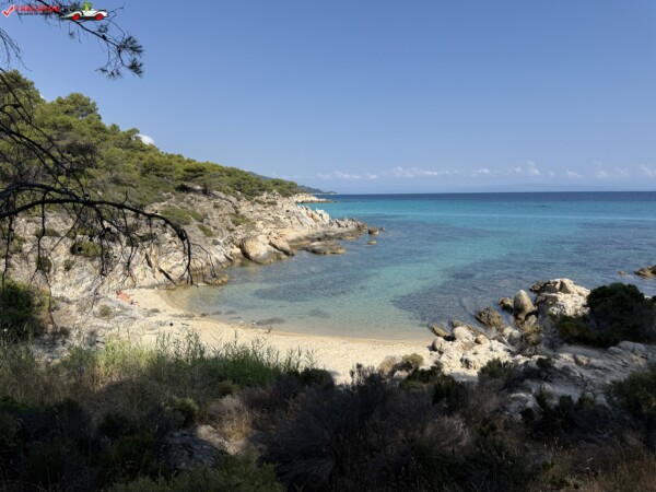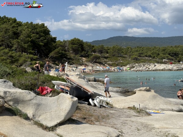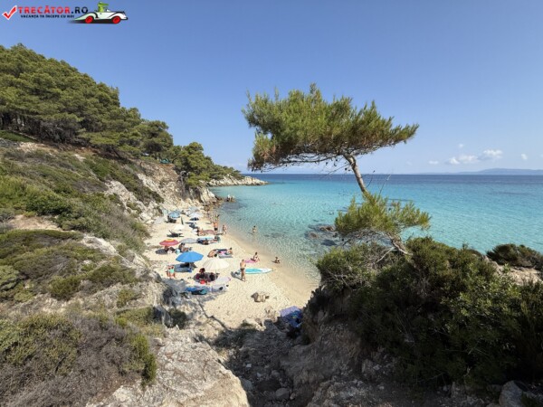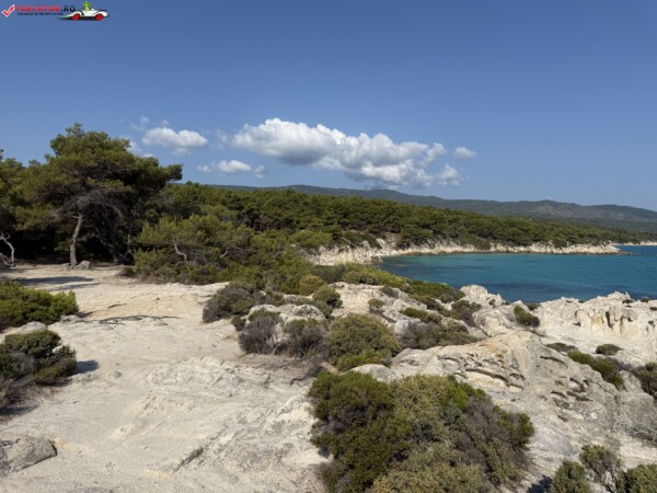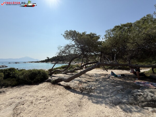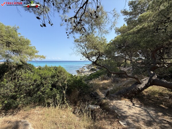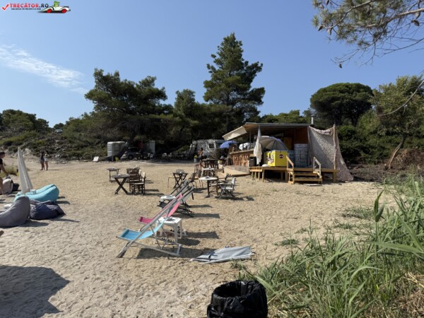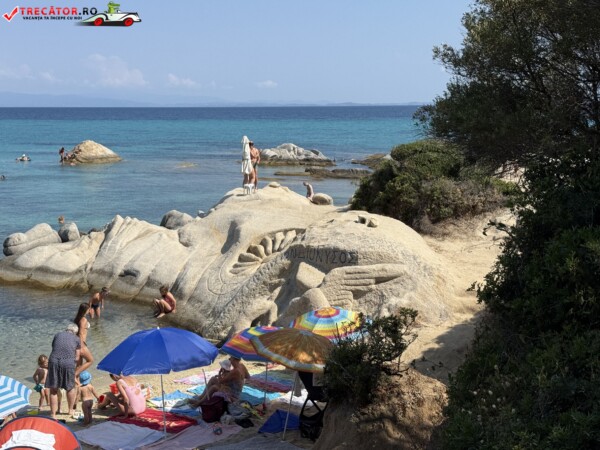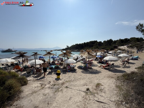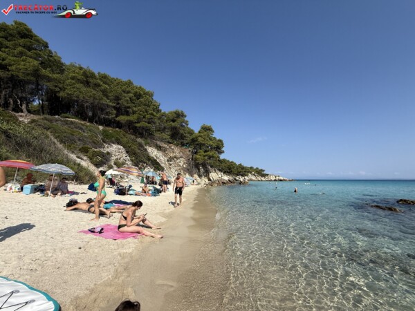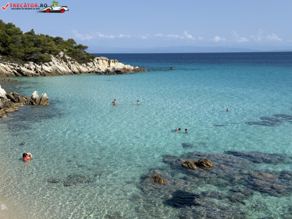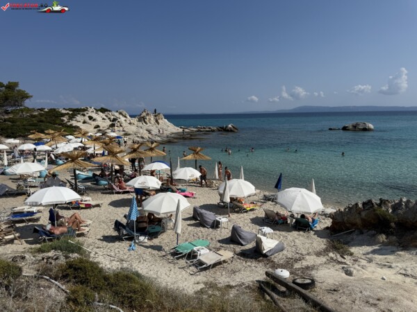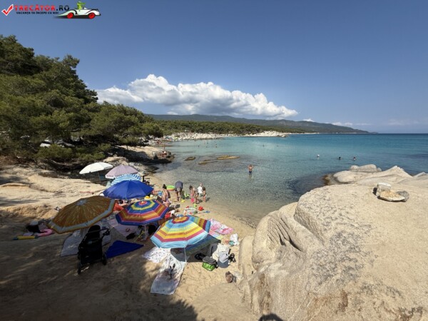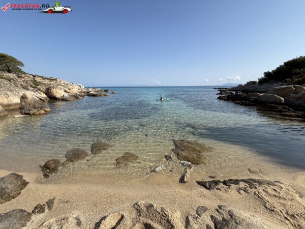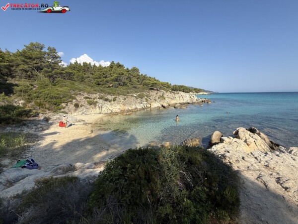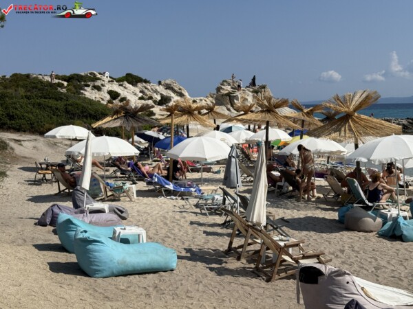 Principala „Cala Portokali” este amenajată cu șezlonguri și bar, dar covoarele mai mici din jur oferă intimitate totală, umbră din pini și liniște . Accesul se face cu mașina, pe un drum forestier neasfaltat și apoi pe jos câțiva zeci de metri, existând locuri de parcare lângă traseu . Nu există toalete, dușuri sau salvamari, așa că e indicat să vii cu apă, gustări și umbrele personale, mai ales în vârf de sezon . Pentru fotografi, snorkelari și aventurieri, acest loc este un paradis – se pot explora peșteri subacvatice, formațiuni stâncoase și covoare de nisip izolate.