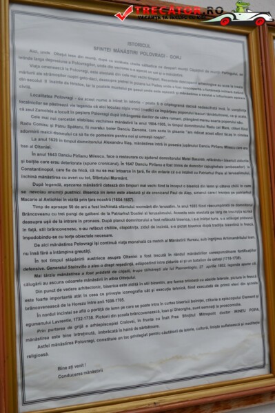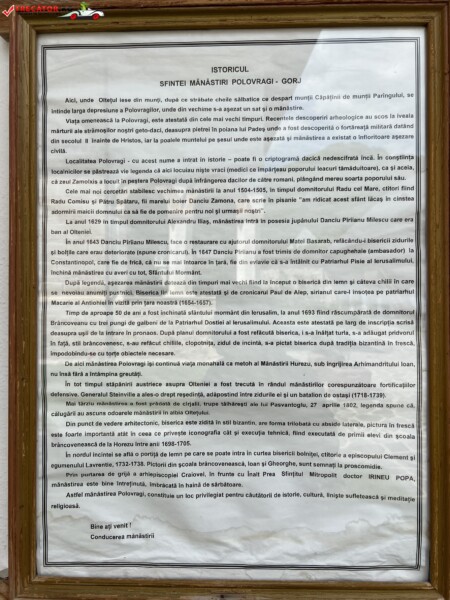Mânăstirea Polovragi Published 28 noiembrie 2017 · Updated 22 aprilie 2025 Mănăstirea Polovragi are o vechime de 500 de ani (1505), ctitori de început ai acestui lăcaş sunt Radu şi Pătru, fiii lui Danciul Zamona, menţionaţi într-un hrisov emis la 18 ianuarie 1480 de voievodul Basarab cel Tânăr (1477-1481). Partajează asta: Dă clic pentru a partaja pe Facebook(Se deschide într-o fereastră nouă) Facebook Dă clic pentru a partaja pe X(Se deschide într-o fereastră nouă) X Similare