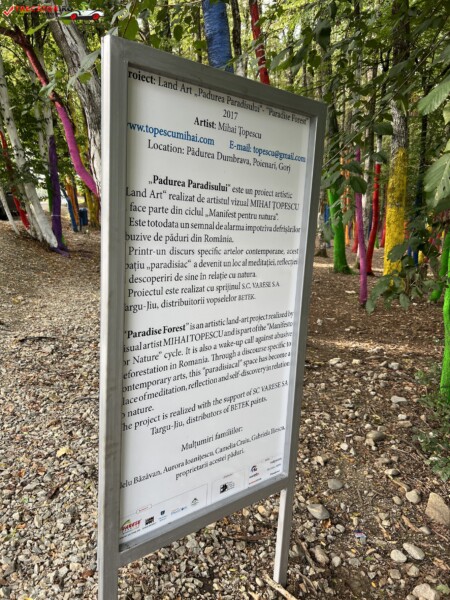 Pădurea Colorată, Baia de Fier. Galerie Foto Published 4 octombrie 2023 · Updated 5 aprilie 2025 Este un proiect ArtLand care a pornit de la ideea artistului vizual Mihai Țopescu. Proiectul se numește „Grădina Paradisului” și este un manifest împotriva defrișărilor ilegale de care suferă tot mai mult România în ultimul timp. Partajează asta: Dă clic pentru a partaja pe Facebook(Se deschide într-o fereastră nouă) Facebook Dă clic pentru a partaja pe X(Se deschide într-o fereastră nouă) X Similare